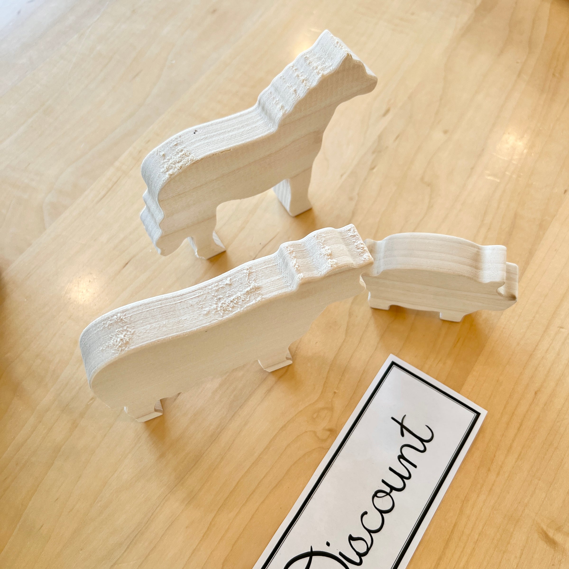 These animals are cut out but left un-sanded. They are being offered in this unfinished state for you to carve, sand, paint, and finish as a DIY project. Please note, there might be areas where wood has flaked off during the cutting process (as shown on the horse hoof).
