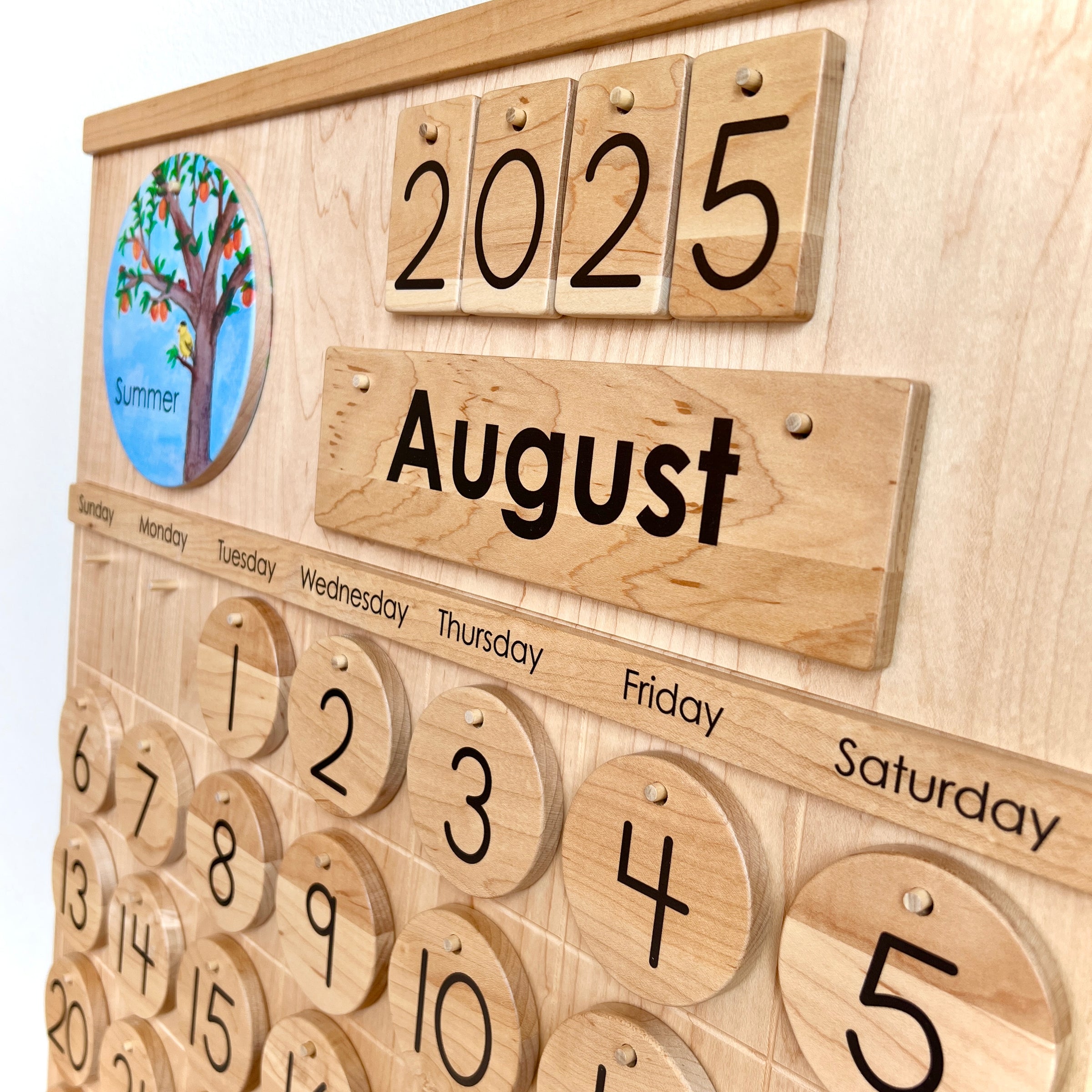 The only calendar you'll ever need to buy--a magnificent hardwood, heirloom calendar measuring a span of 22 inches wide and weighing in at ten pounds! Large enough to see from across a room, making it ideal for many school situations. The season coins feature Jennifer's own watercolor artwork. Flip the number coin each day to show time progressing forward.