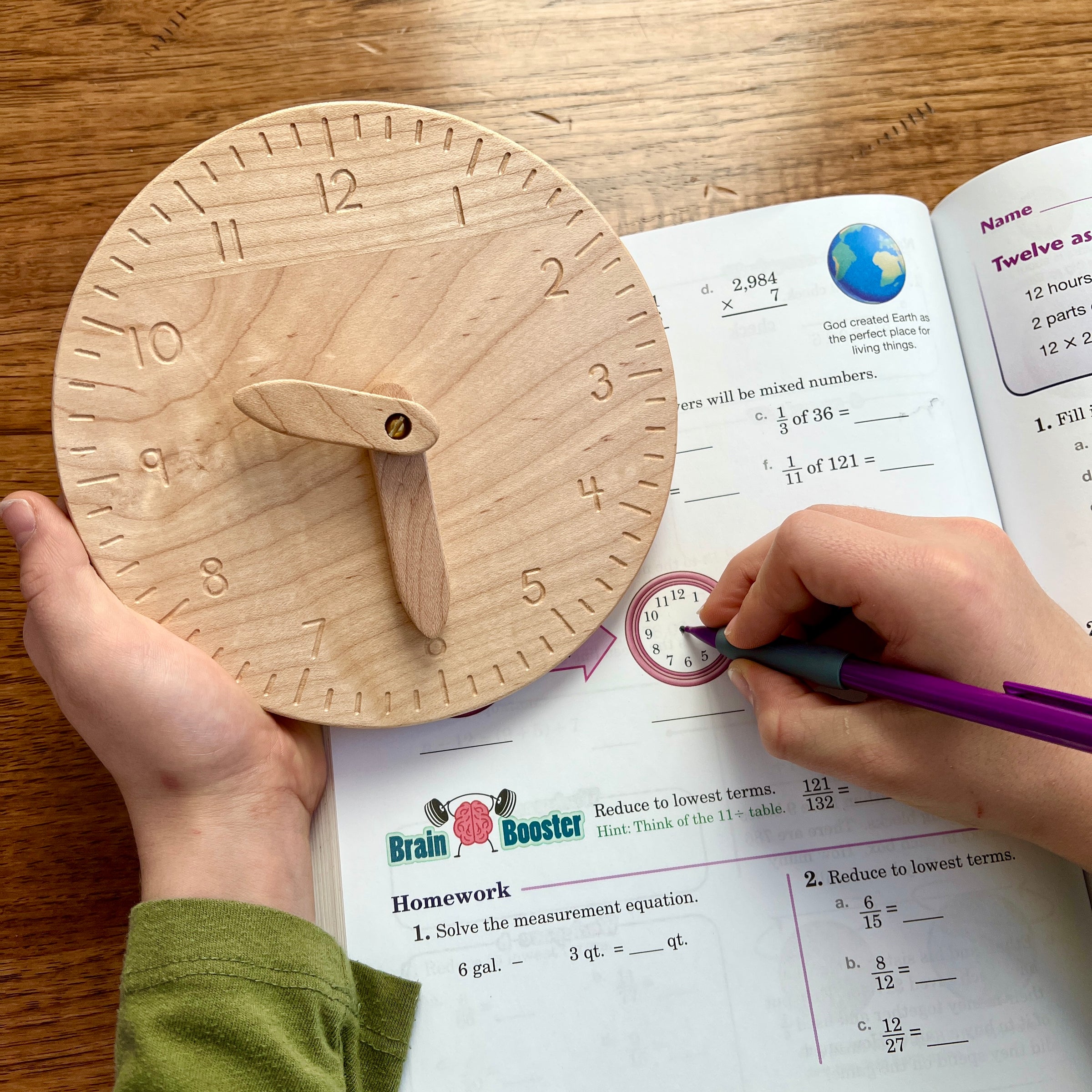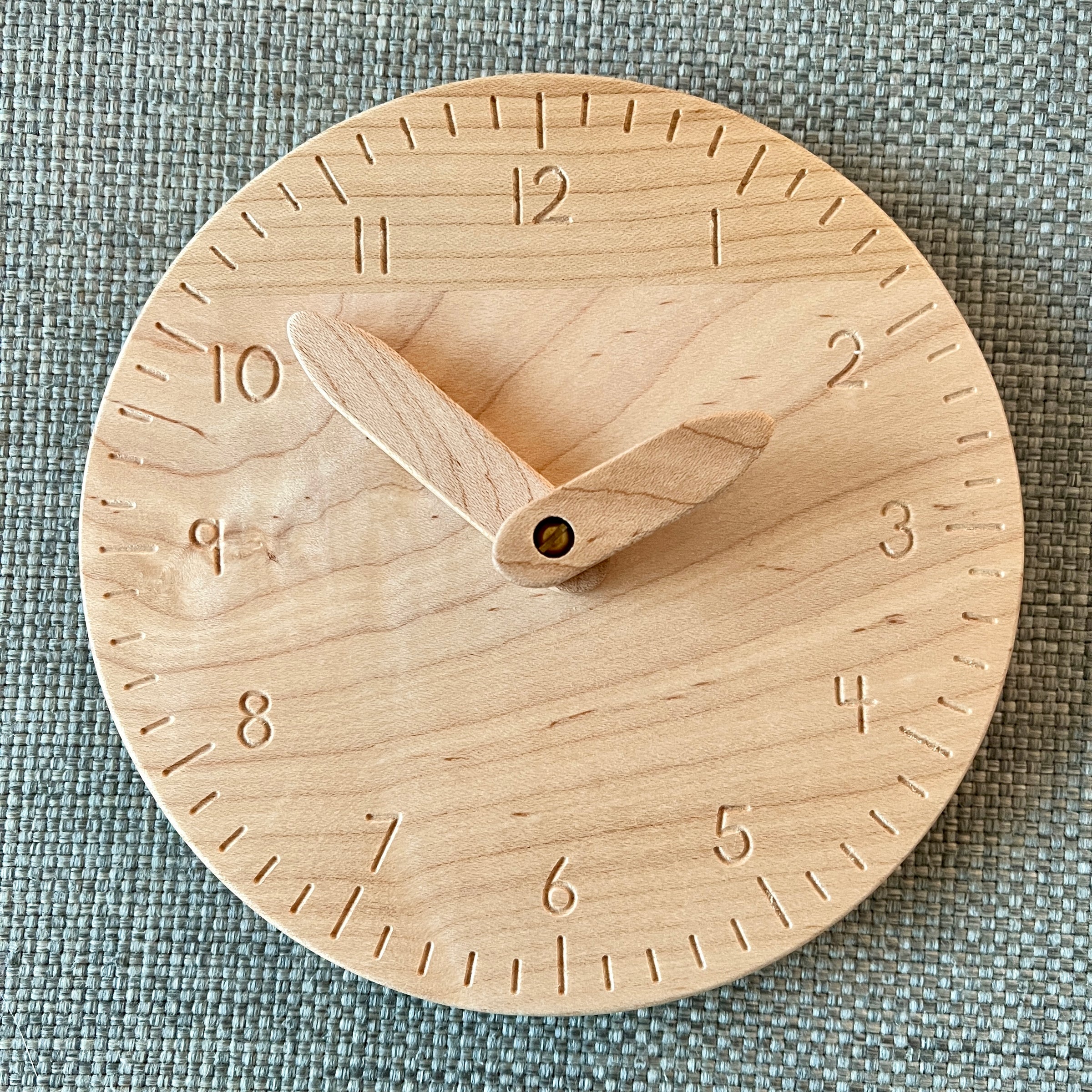 An all natural, simple wooden clock that your child can manipulate to learn the functions of telling time. Both the hour and minute hands move freely. The numbers are engraved into the base.